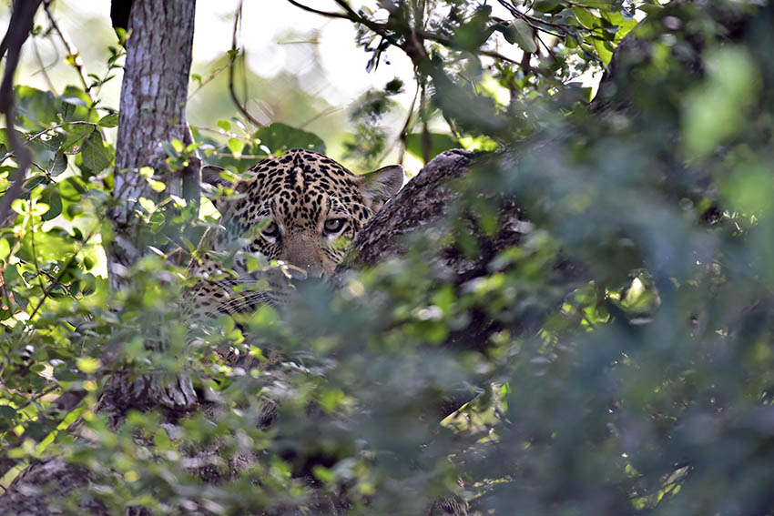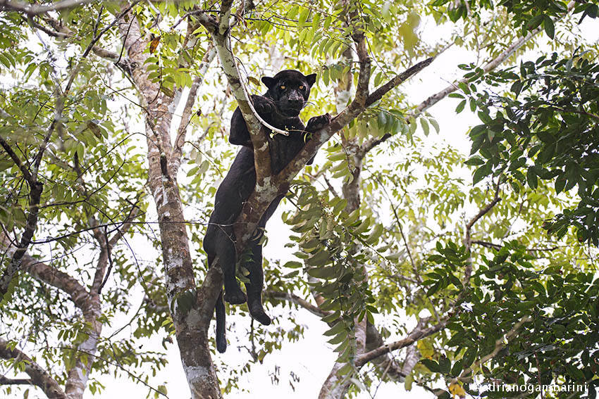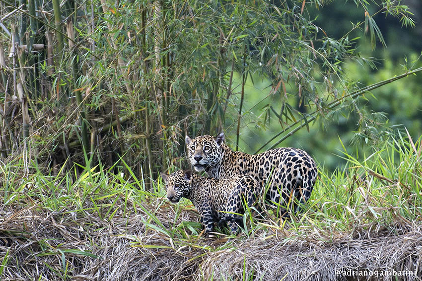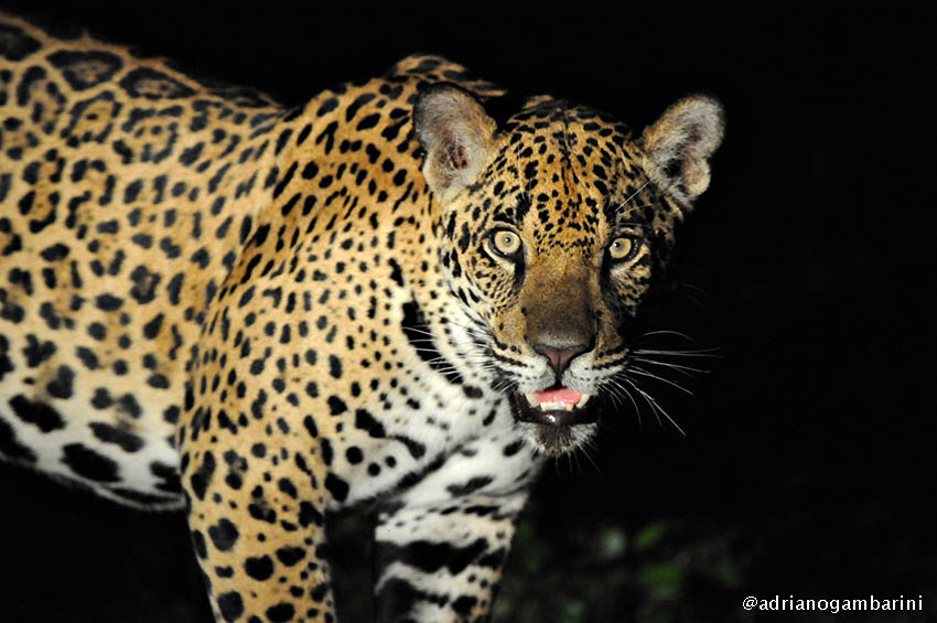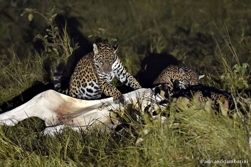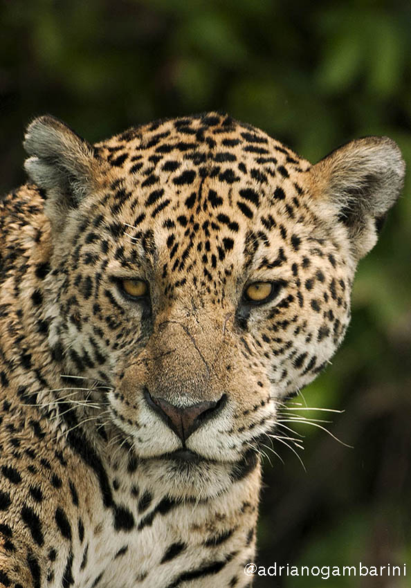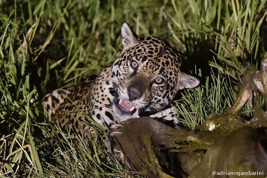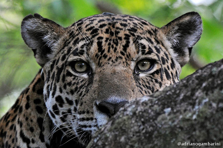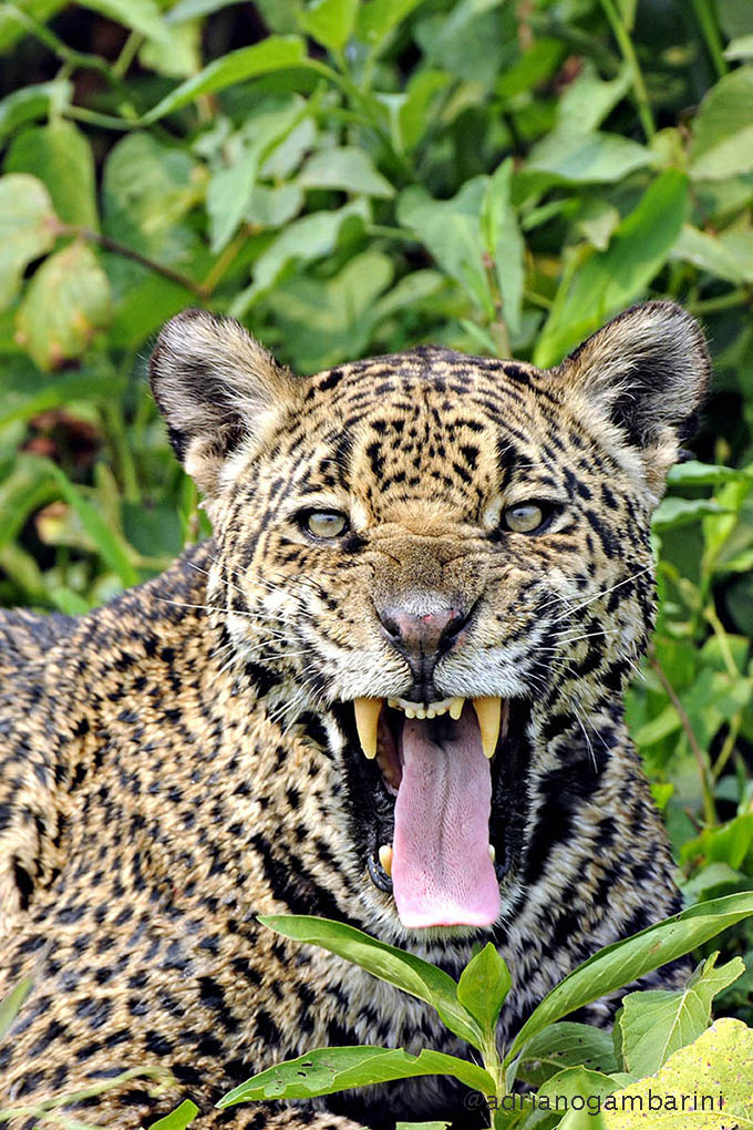 Onça espreita por detrás da vegetação. Foto: Adriano Gambarini.